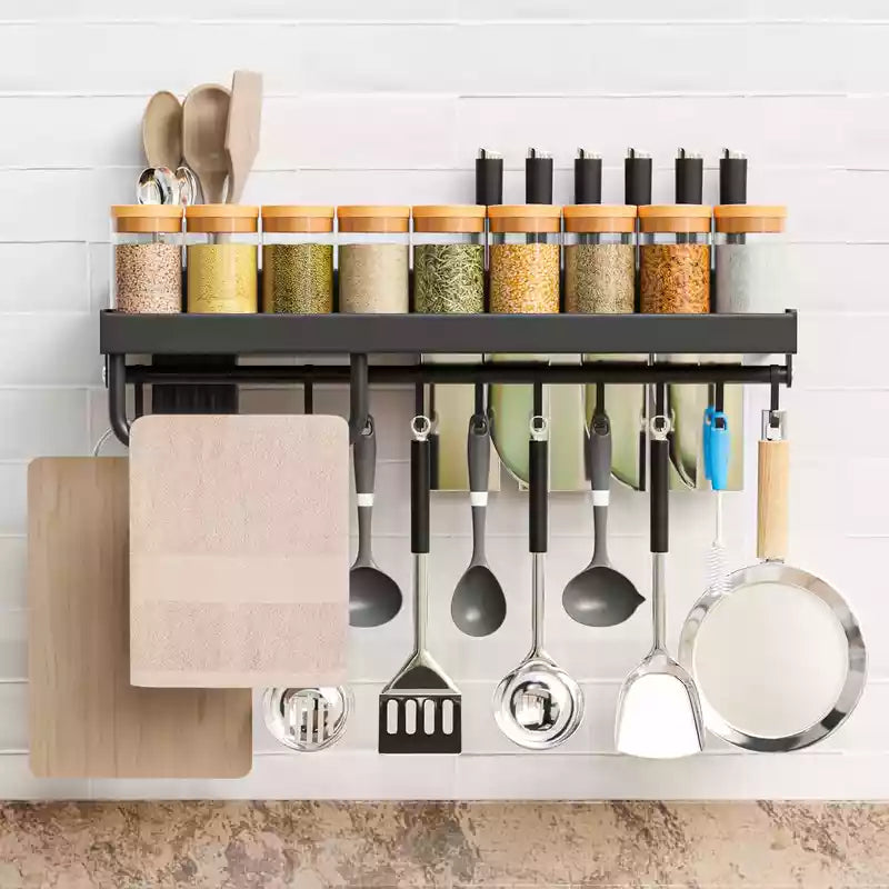 Recibes el panel principal de acero, los ganchos para colgar utensilios, la barra magnética y los tornillos con tacos para la instalación. Todo lo necesario para organizar tu cocina de inmediato.