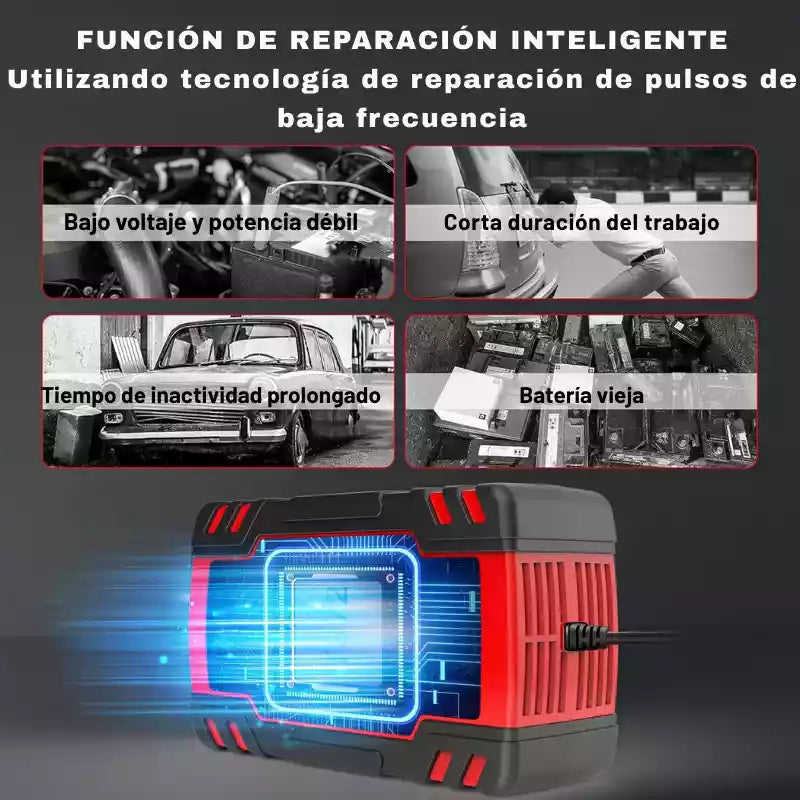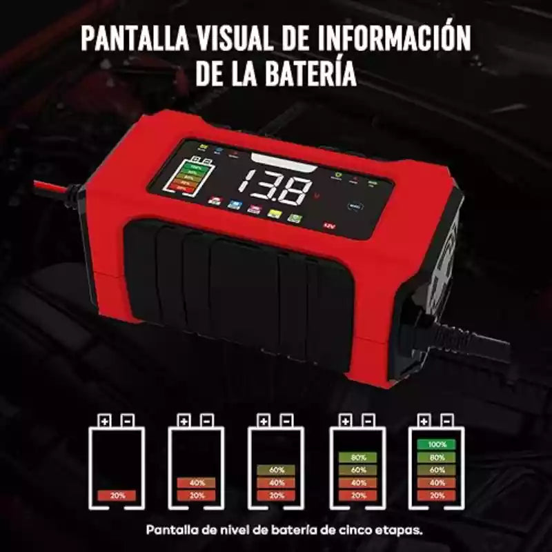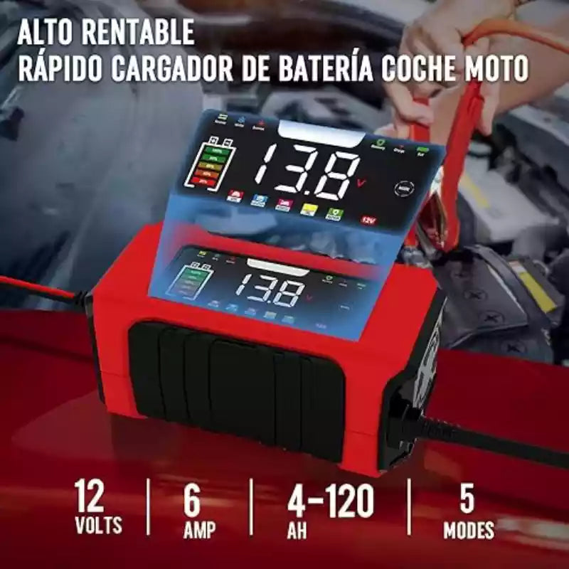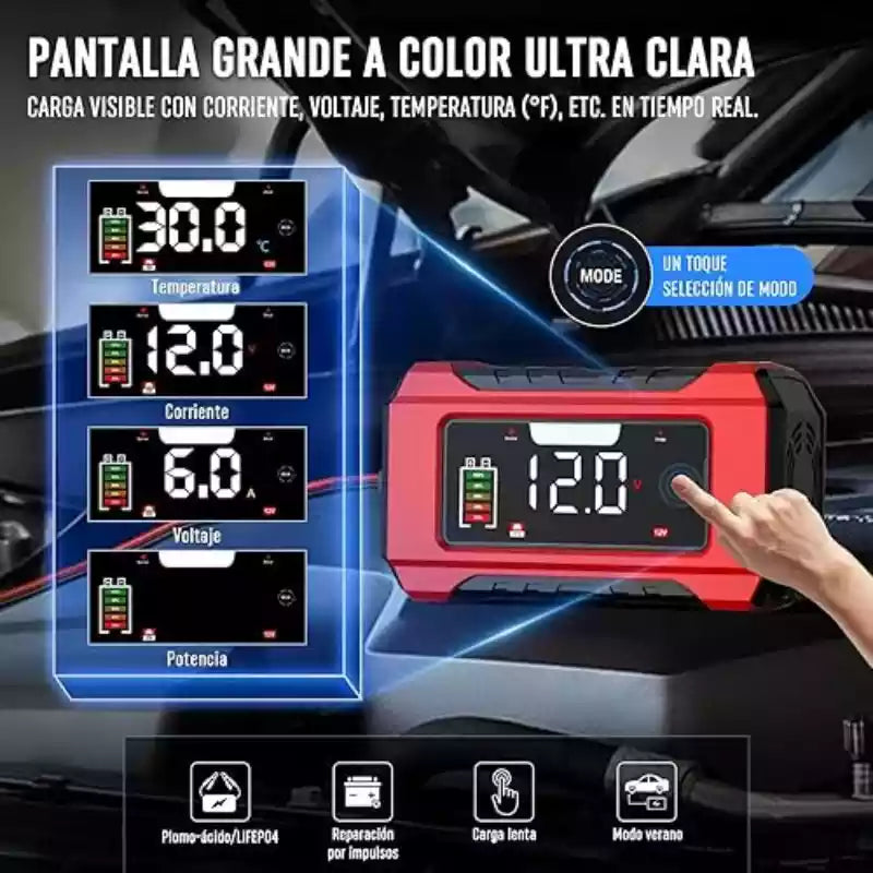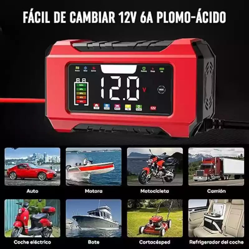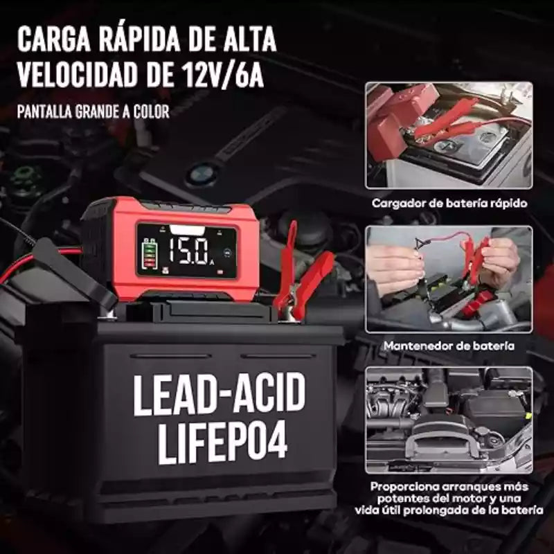 El tiempo varía según la capacidad de la batería (Ah). Por ejemplo, para una batería de 60Ah descargada, a 6A podría tomar alrededor de 10 horas. La pantalla LCD te irá mostrando el progreso en porcentaje.